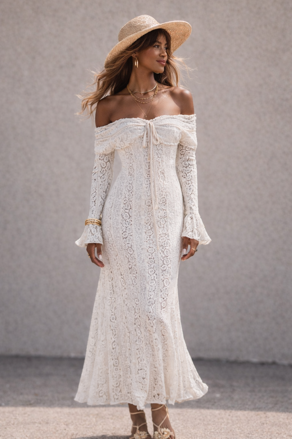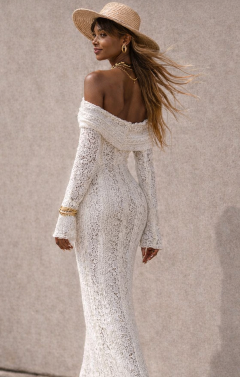 Bohemian Lace Maxi Jurk Off-Shoulder β CrΓ¨me/Wit